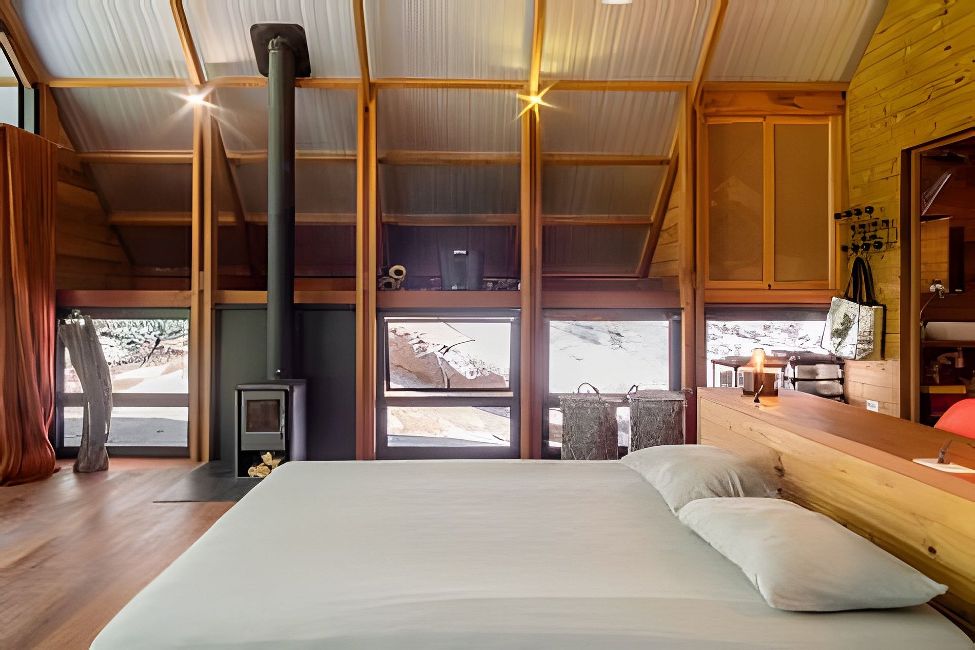 Acomoda 4 a 6 pessoas com conforto e estilo. Conta com suíte master de 45 m² (cama king), TV para assistir sua série preferida, mezanino com cama queen e opção de cama extra de solteiro. São dois banheiros completos em madeira, com água quente a gás. A sala de estar integra uma mesa de jantar para 6 pessoas e uma cozinha totalmente equipada, tendo ilha com cooktop, forno, geladeira, panelas e cafeteira. A casa possui duas lareiras para o inverno. Na área externa, há churrasqueira a gás, chuveriro e espaço para fogueira perfeita para relaxar sob as estrelas. A cachoeira privativa fica a apenas 10 minutos a pé, ideal para um mergulho ou meditação em meio à natureza.