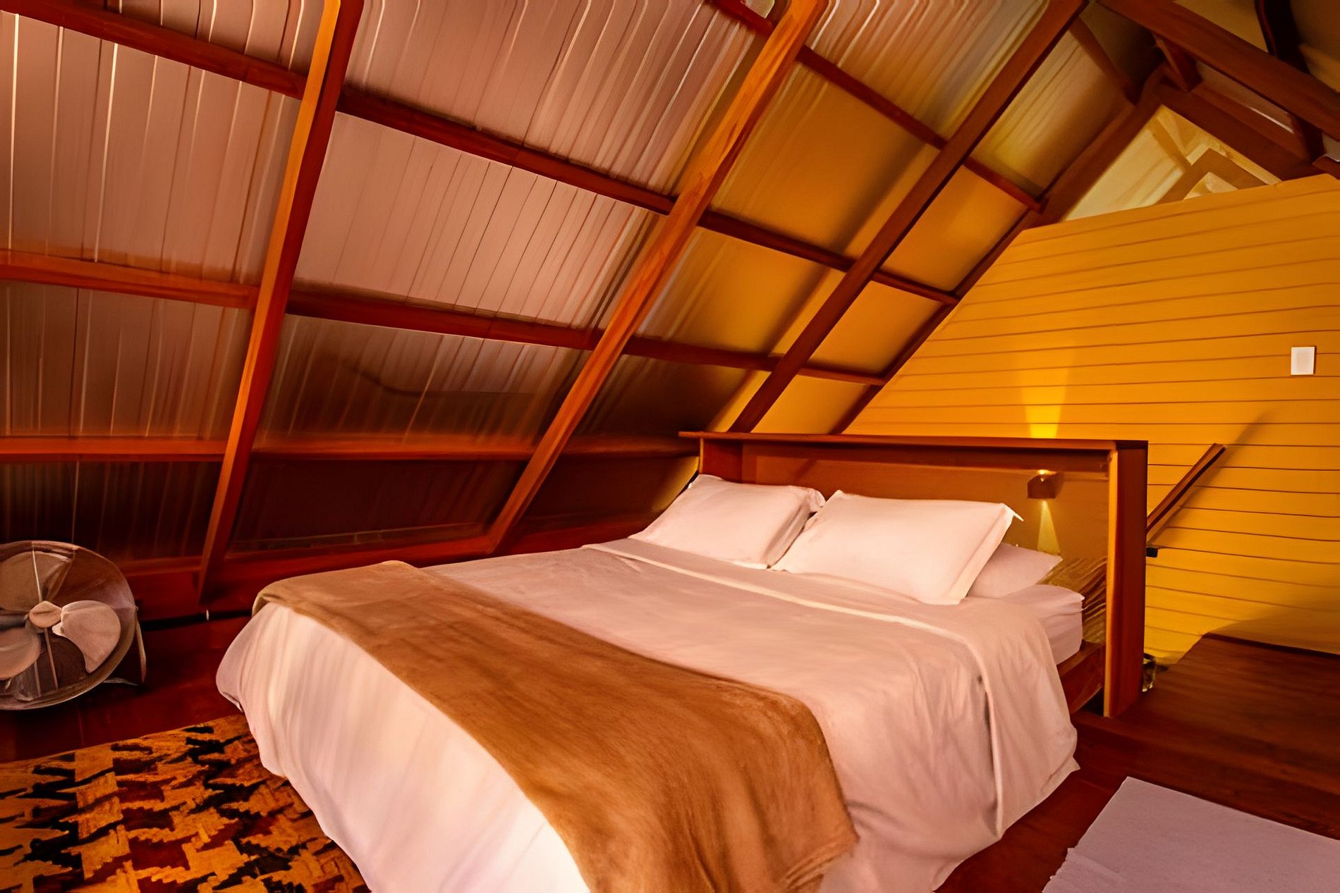 Acomoda 4 a 6 pessoas com conforto e estilo. Conta com suíte master de 45 m² (cama king), TV para assistir sua série preferida, mezanino com cama queen e opção de cama extra de solteiro. São dois banheiros completos em madeira, com água quente a gás. A sala de estar integra uma mesa de jantar para 6 pessoas e uma cozinha totalmente equipada, tendo ilha com cooktop, forno, geladeira, panelas e cafeteira. A casa possui duas lareiras para o inverno. Na área externa, há churrasqueira a gás, chuveriro e espaço para fogueira perfeita para relaxar sob as estrelas. A cachoeira privativa fica a apenas 10 minutos a pé, ideal para um mergulho ou meditação em meio à natureza.