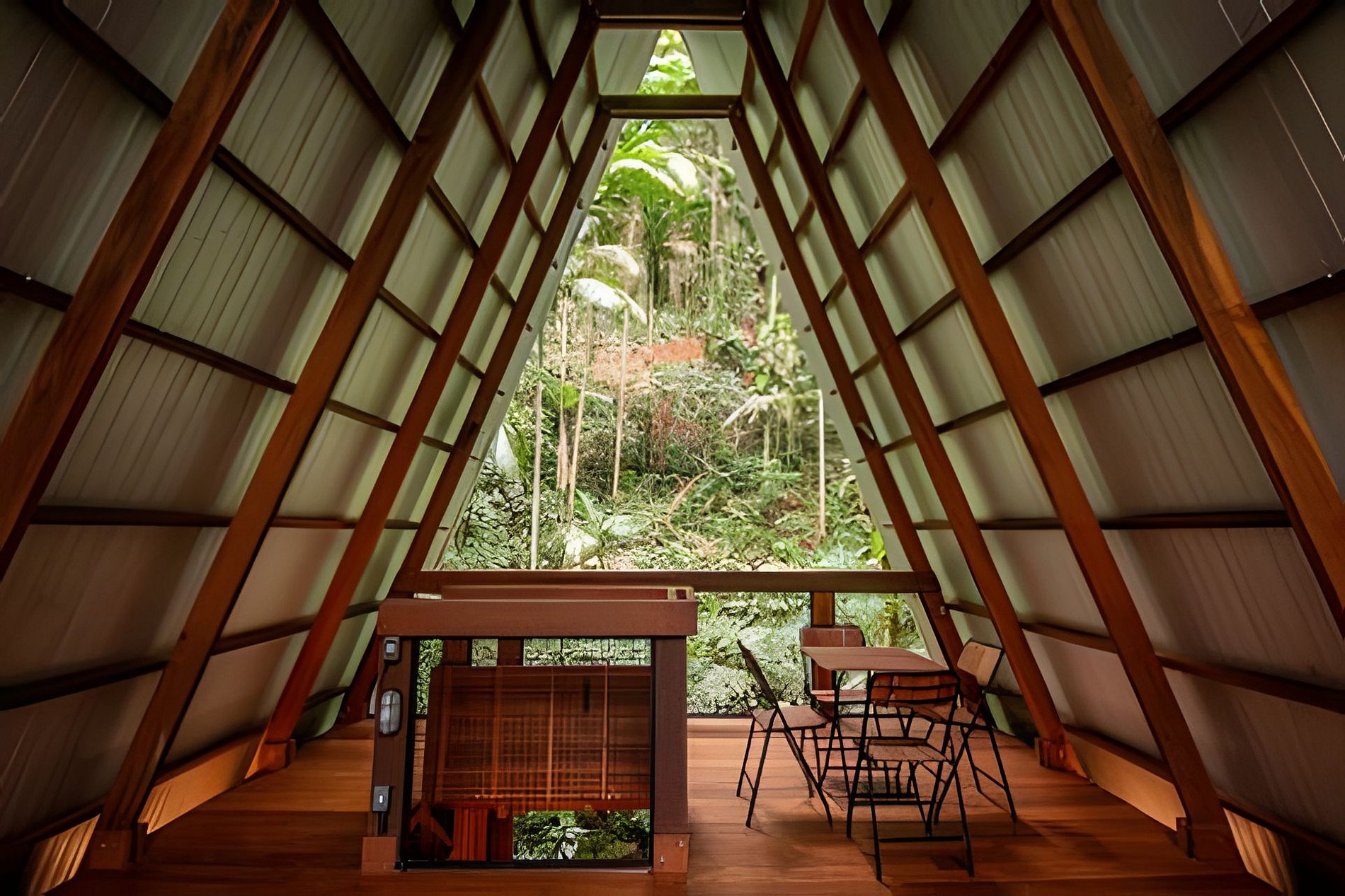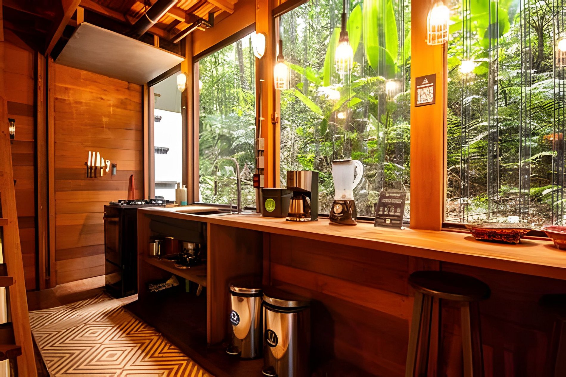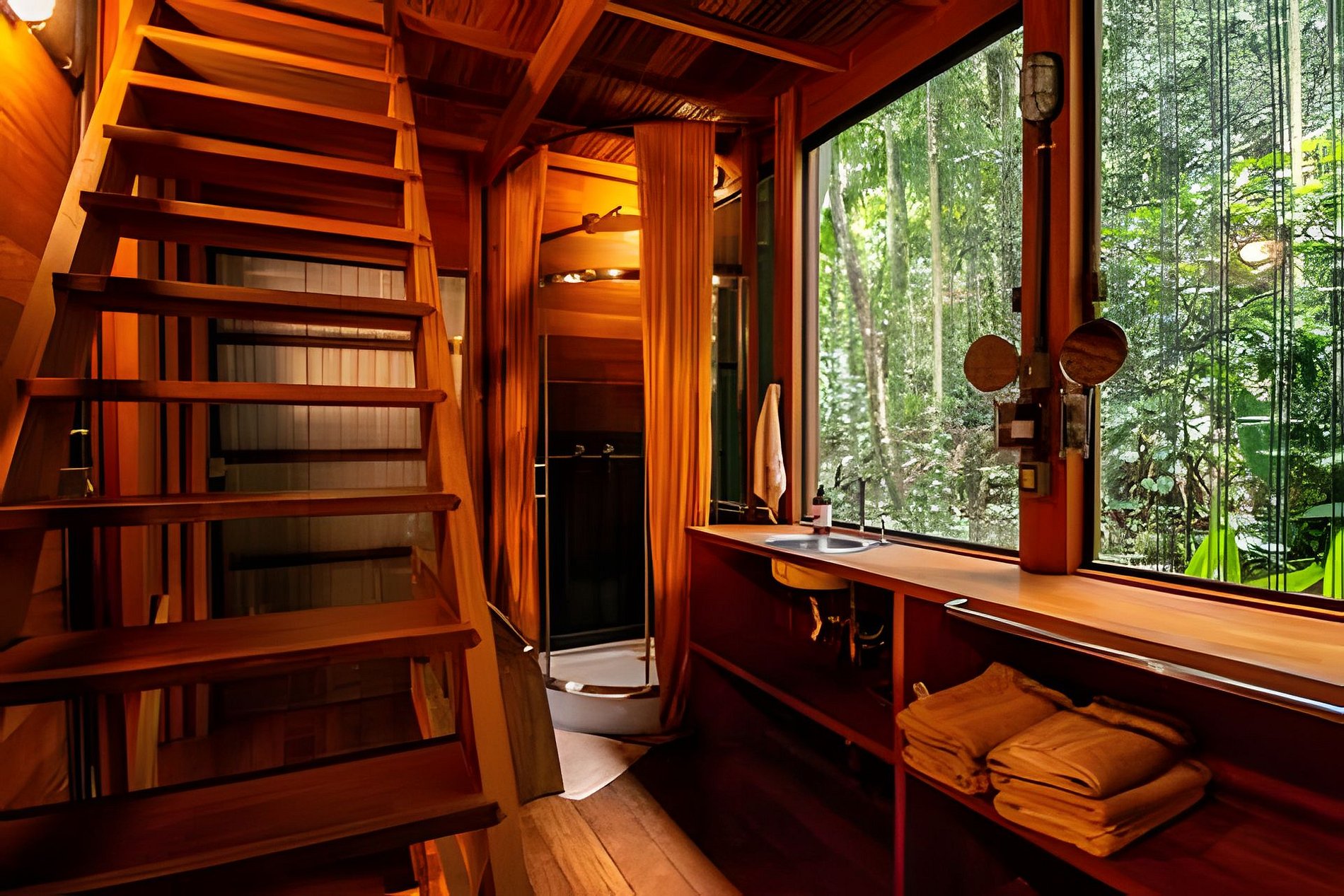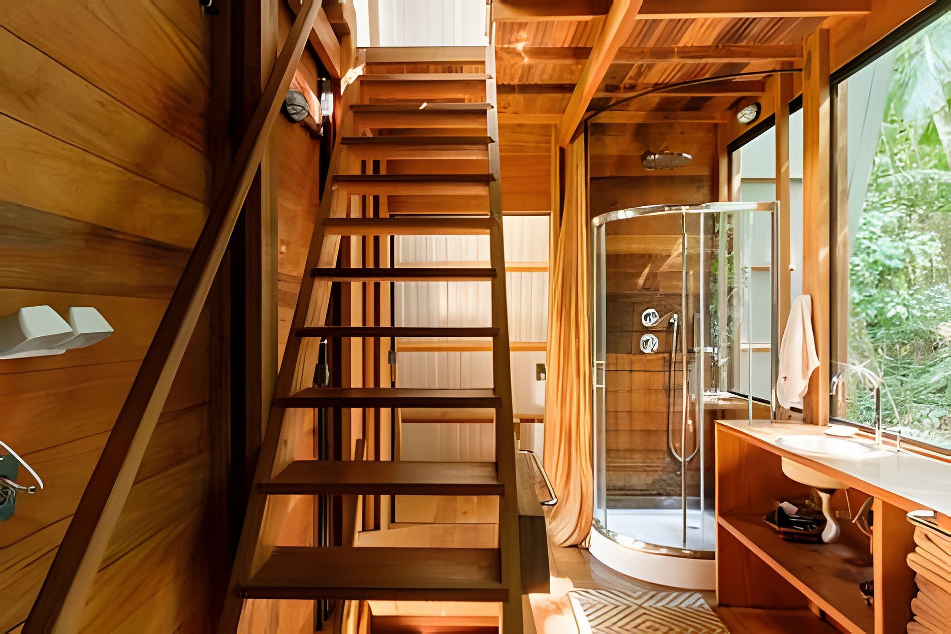 A casa possui um quarto com cama de casal e uma sala de estar com um sofá-cama muito confortável (Ortobom), que se transforma em outro quarto de casal quando necessário. A cozinha e o banheiro têm acesso separado, assim como o generoso terraço no último andar, ideal para yoga e lazer. Por fim, no subsolo há uma mesa e uma churrasqueira gourmet a gás! A tipologia da casa combina a arquitetura indígena brasileira com o artesanato contemporâneo em madeira fina e materiais tecnológicos, permitindo uma construção leve e sustentável que se integra suavemente ao terreno, sem interferências.