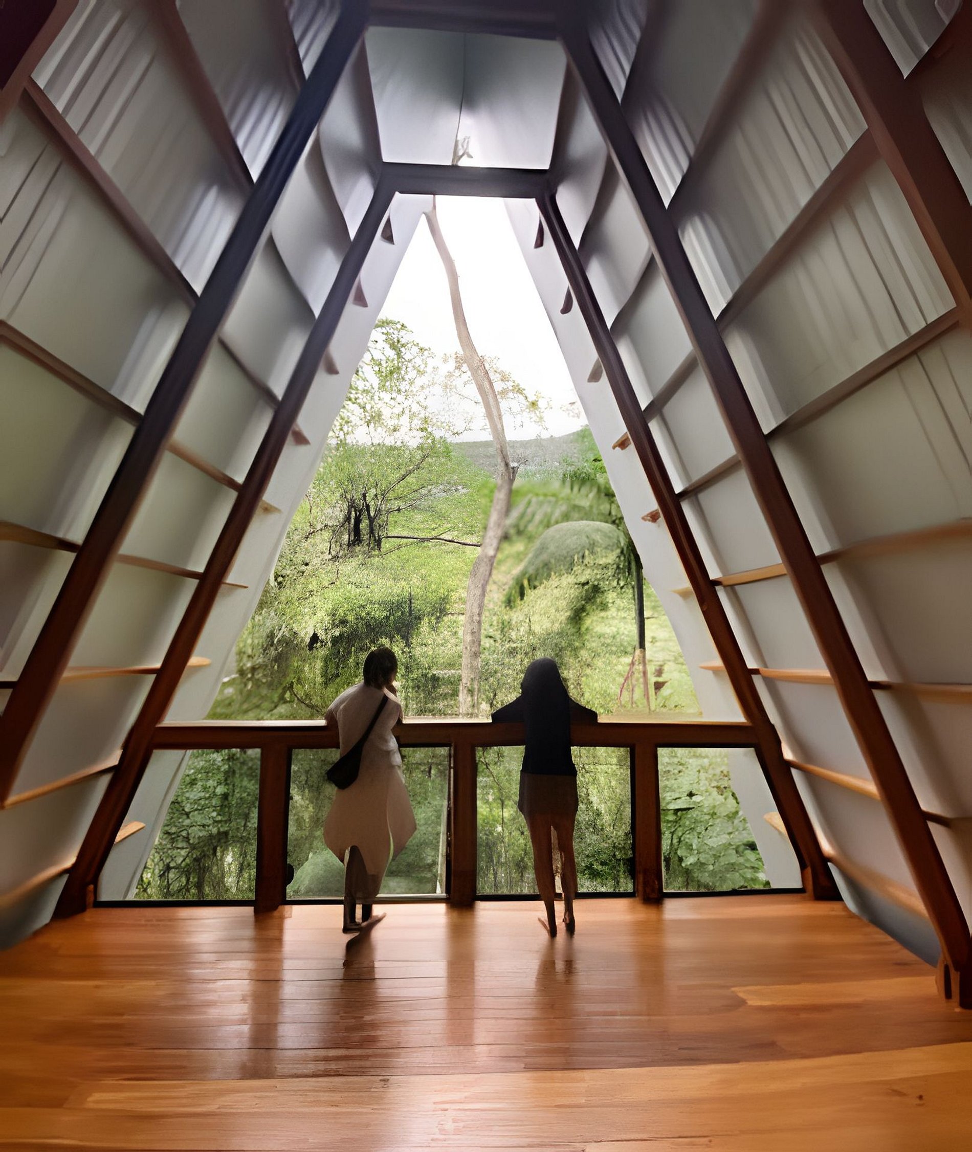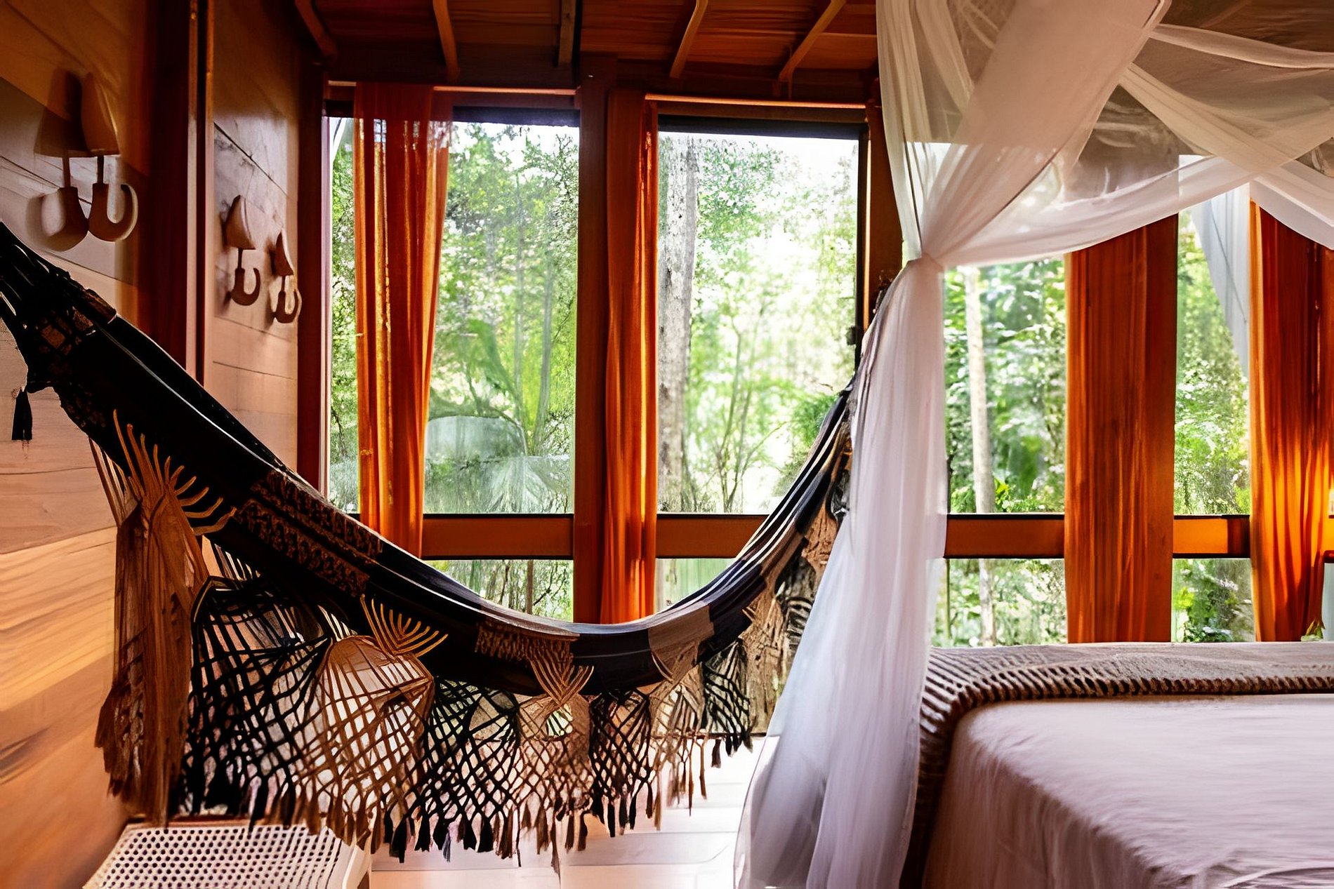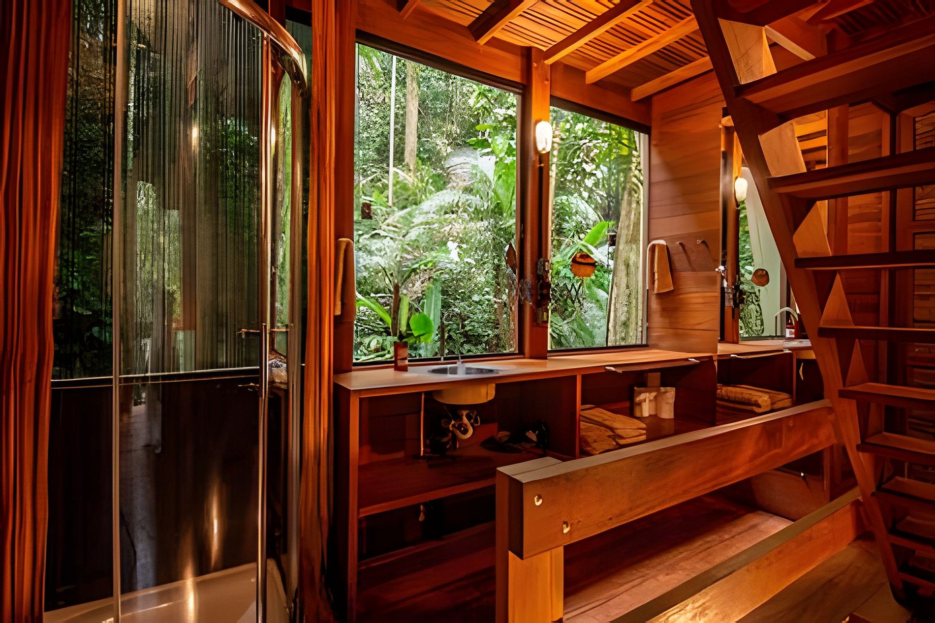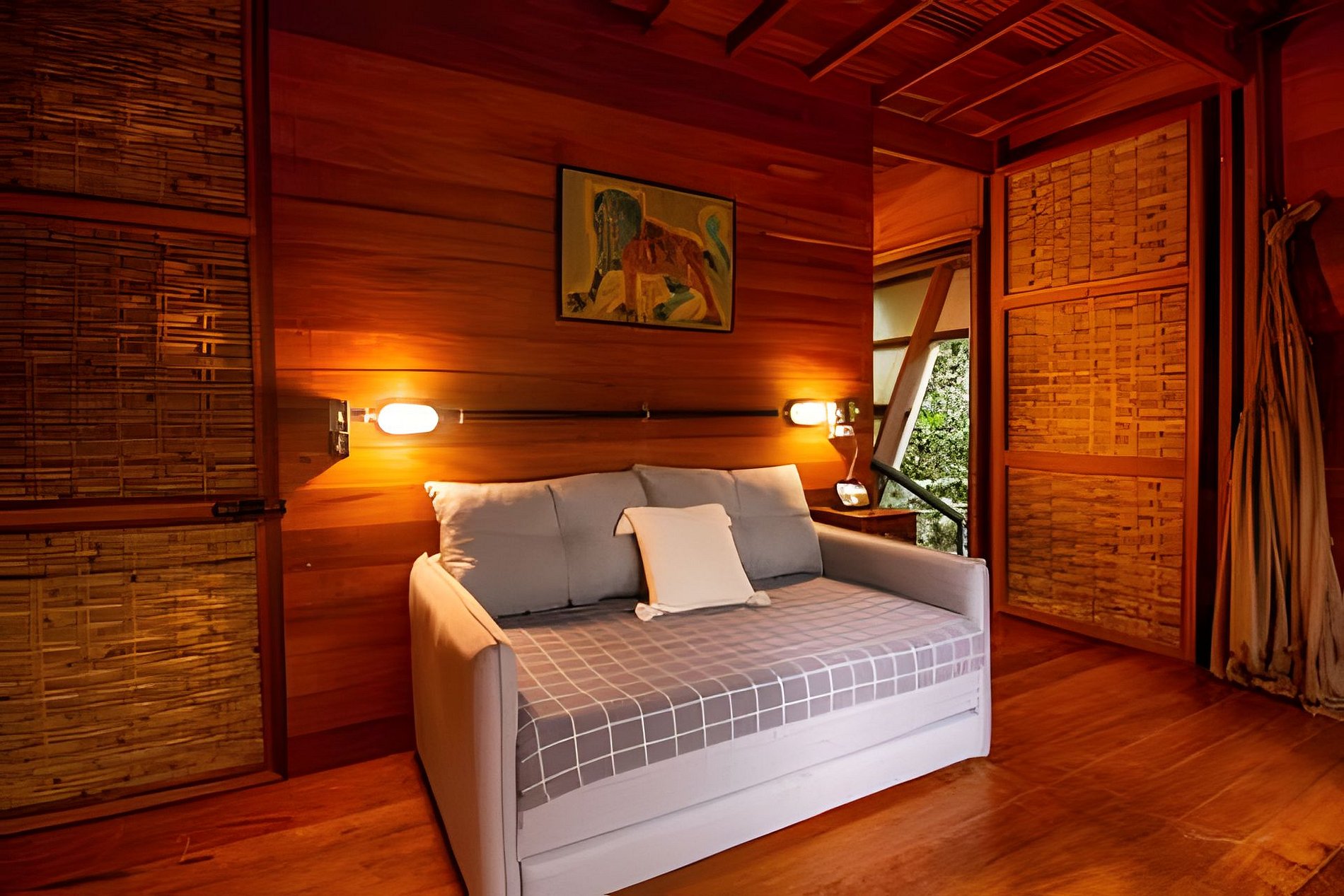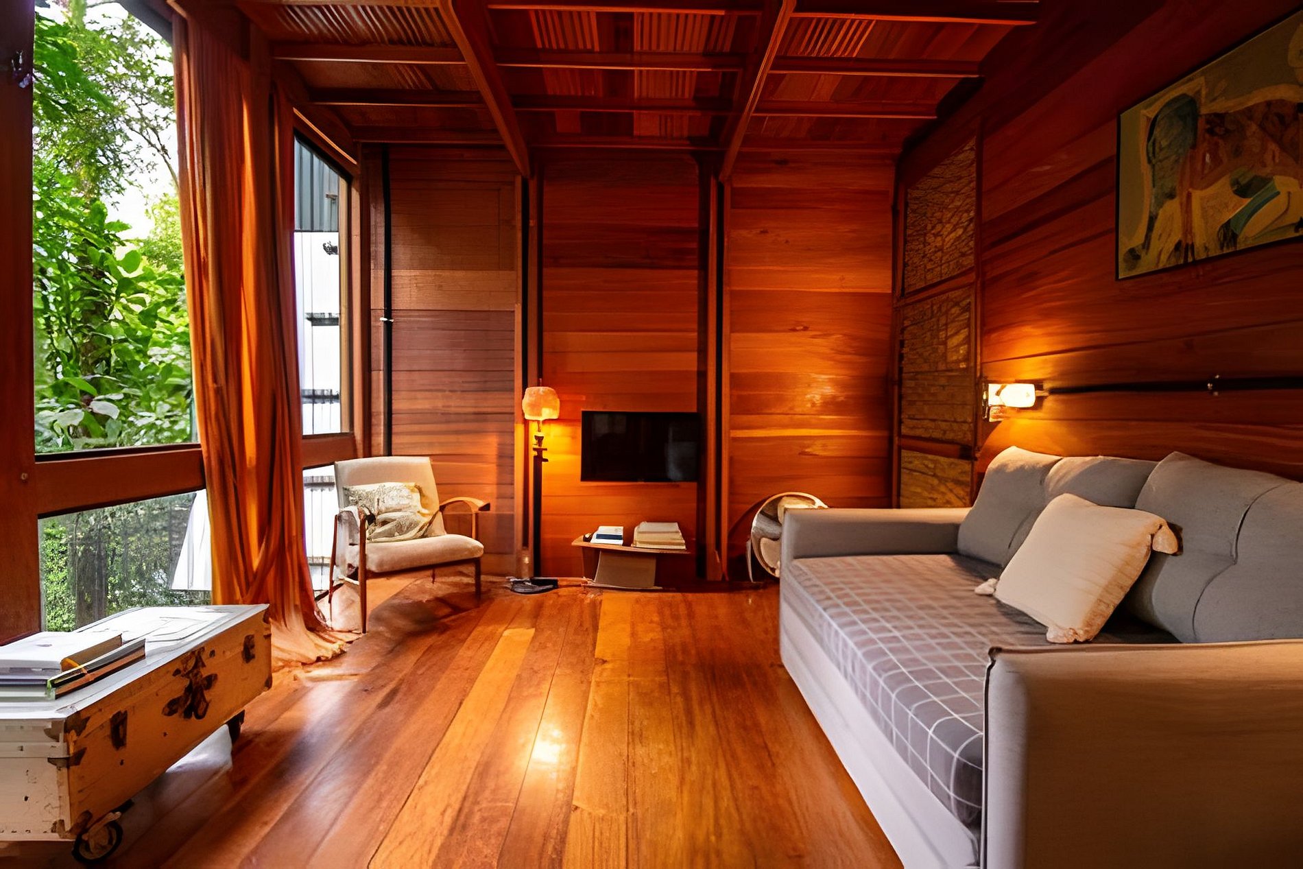A casa possui um quarto com cama de casal e uma sala de estar com um sofá-cama muito confortável (Ortobom), que se transforma em outro quarto de casal quando necessário. A cozinha e o banheiro têm acesso separado, assim como o generoso terraço no último andar, ideal para yoga e lazer. Por fim, no subsolo há uma mesa e uma churrasqueira gourmet a gás! A tipologia da casa combina a arquitetura indígena brasileira com o artesanato contemporâneo em madeira fina e materiais tecnológicos, permitindo uma construção leve e sustentável que se integra suavemente ao terreno, sem interferências.