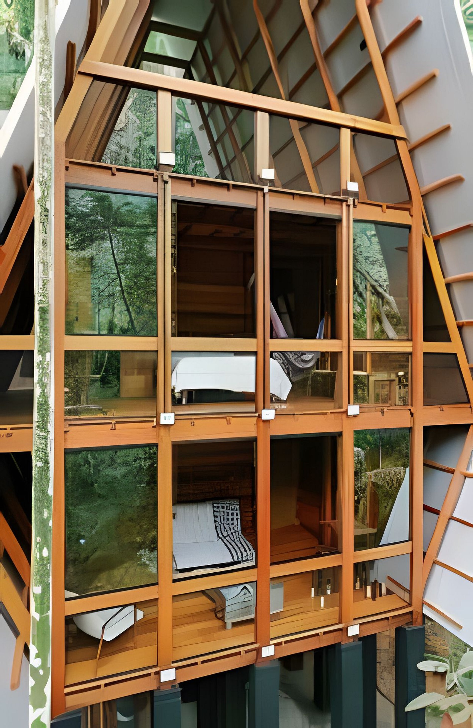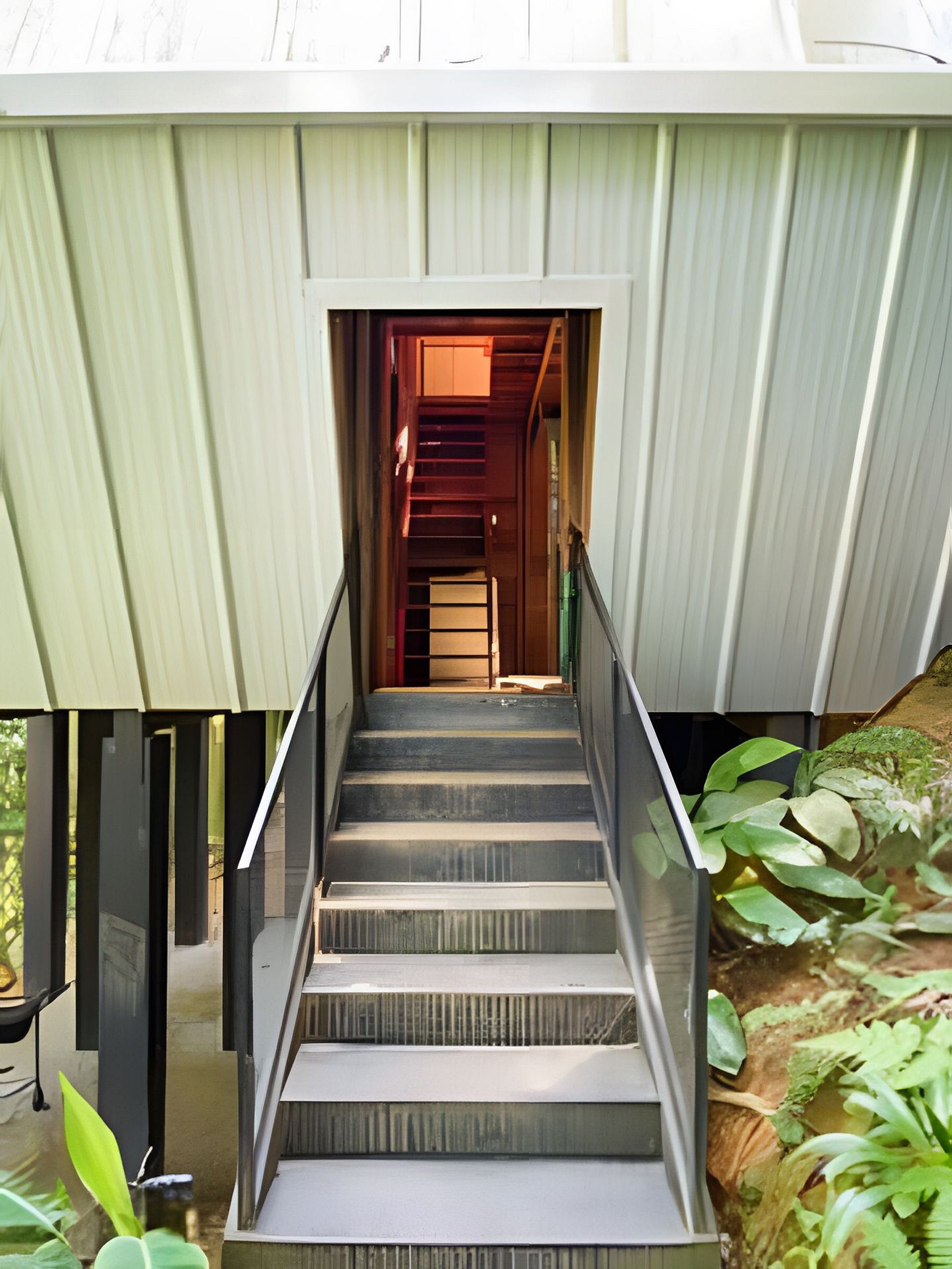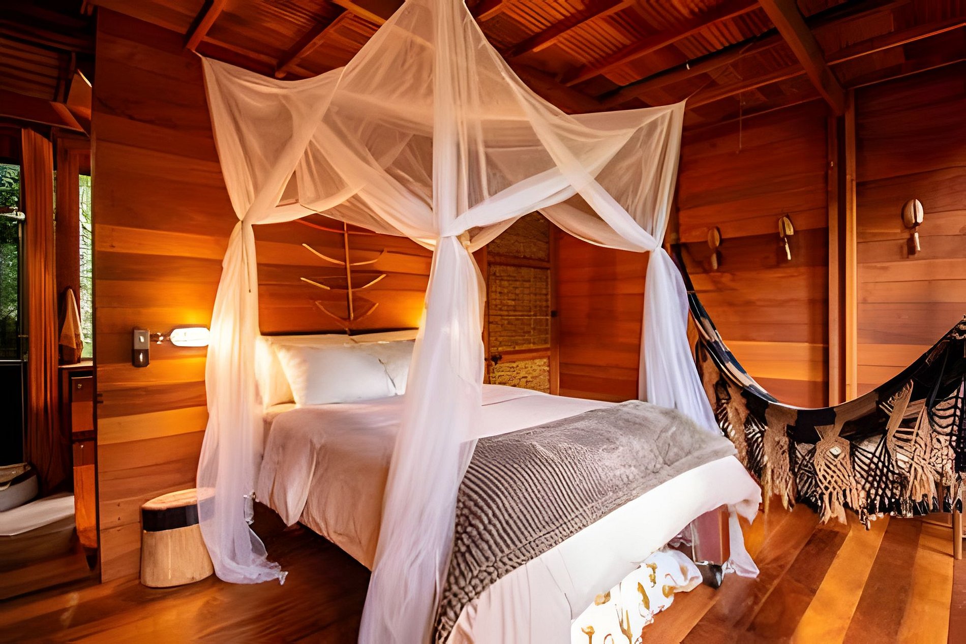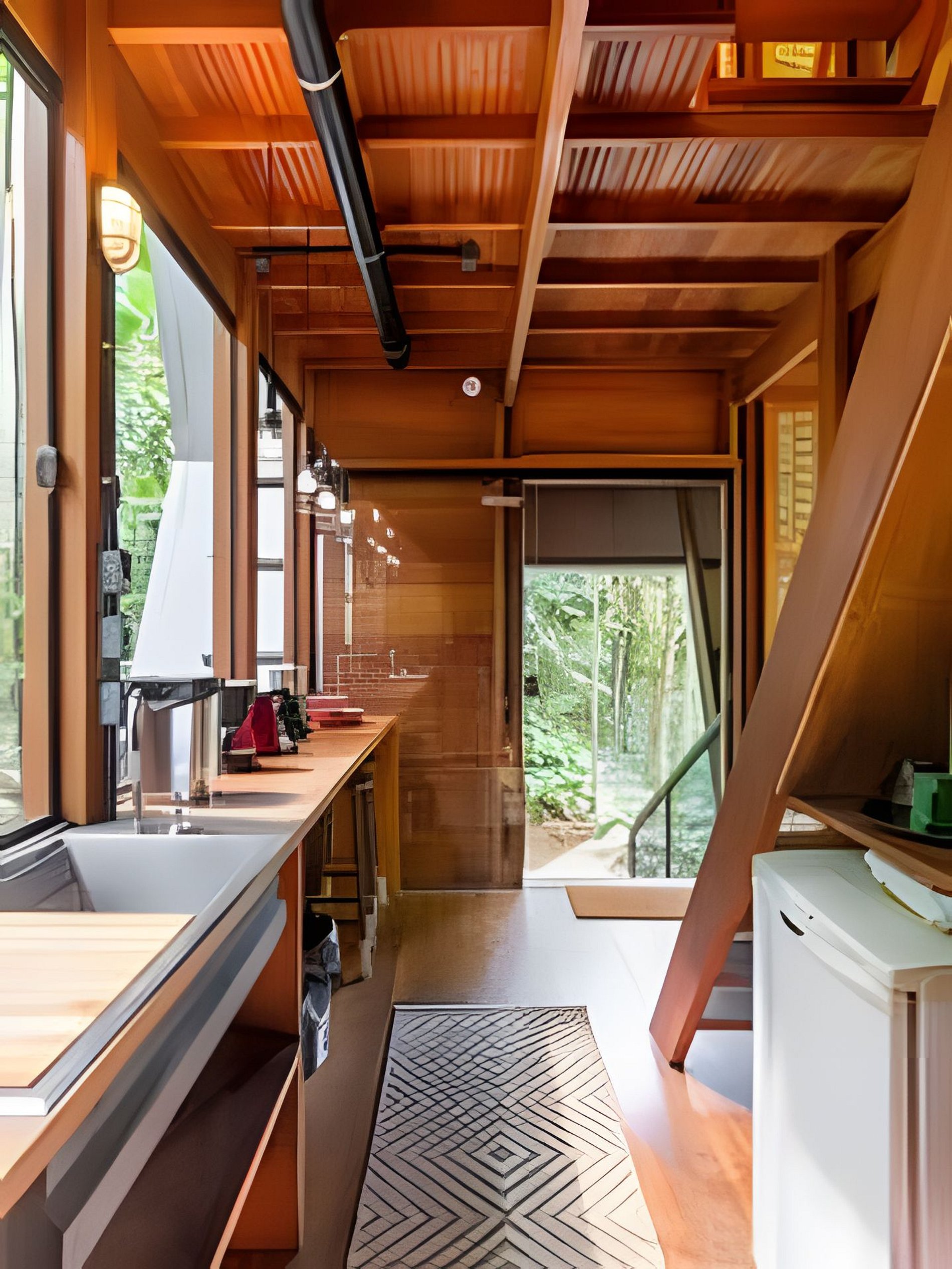 A casa possui um quarto com cama de casal e uma sala de estar com um sofá-cama muito confortável (Ortobom), que se transforma em outro quarto de casal quando necessário. A cozinha e o banheiro têm acesso separado, assim como o generoso terraço no último andar, ideal para yoga e lazer. Por fim, no subsolo há uma mesa e uma churrasqueira gourmet a gás! A tipologia da casa combina a arquitetura indígena brasileira com o artesanato contemporâneo em madeira fina e materiais tecnológicos, permitindo uma construção leve e sustentável que se integra suavemente ao terreno, sem interferências.
