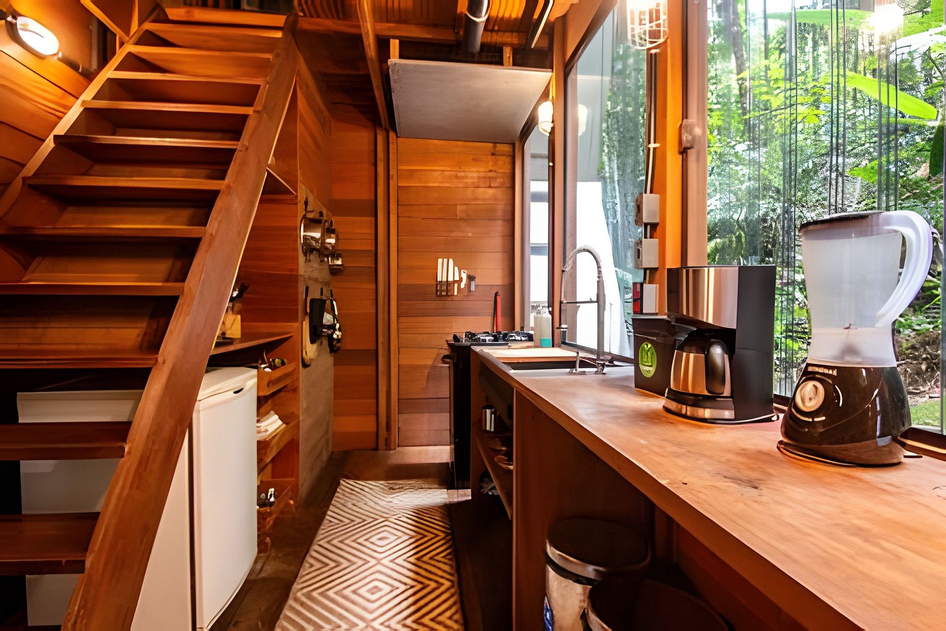 A casa possui um quarto com cama de casal e uma sala de estar com um sofá-cama muito confortável (Ortobom), que se transforma em outro quarto de casal quando necessário. A cozinha e o banheiro têm acesso separado, assim como o generoso terraço no último andar, ideal para yoga e lazer. Por fim, no subsolo há uma mesa e uma churrasqueira gourmet a gás! A tipologia da casa combina a arquitetura indígena brasileira com o artesanato contemporâneo em madeira fina e materiais tecnológicos, permitindo uma construção leve e sustentável que se integra suavemente ao terreno, sem interferências.