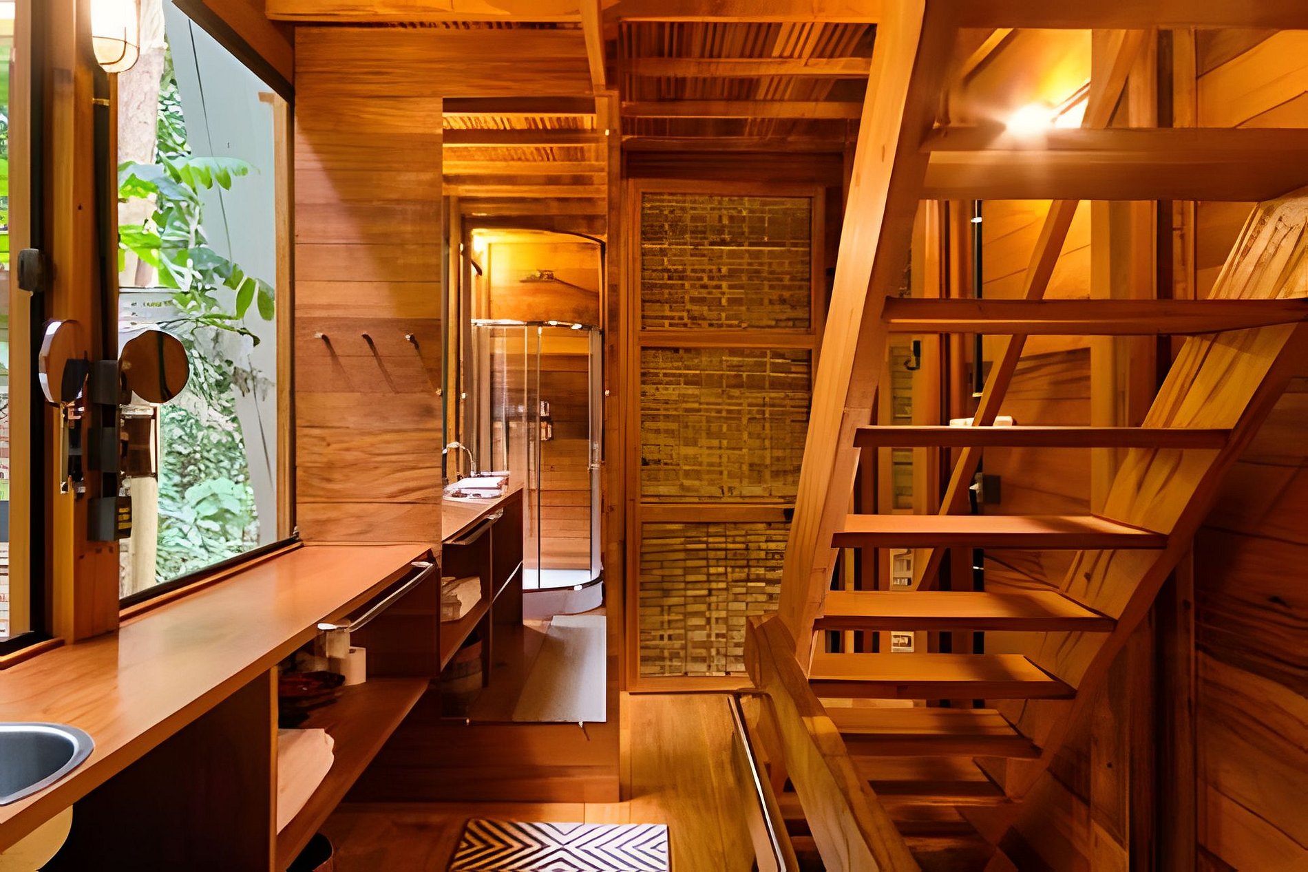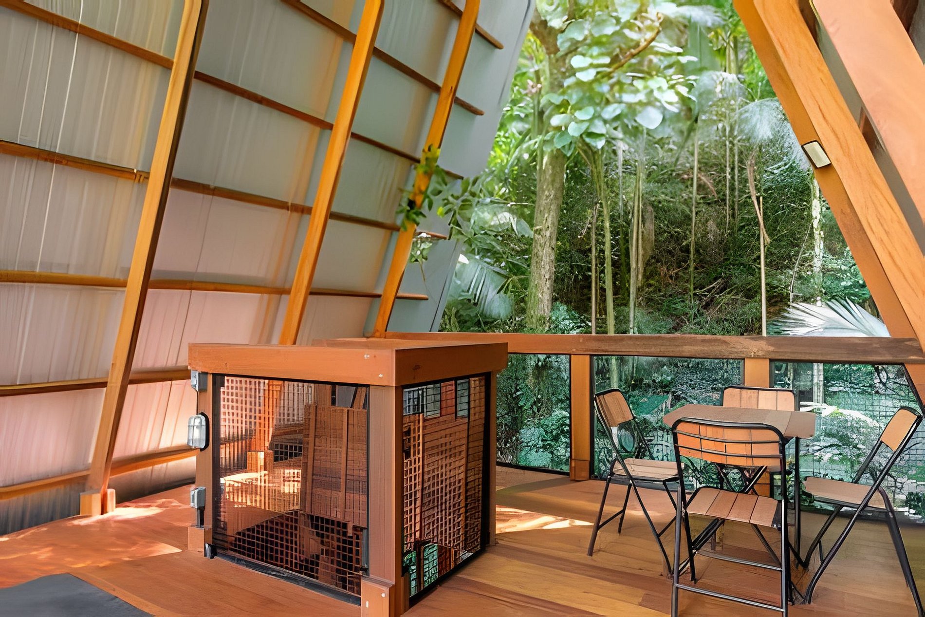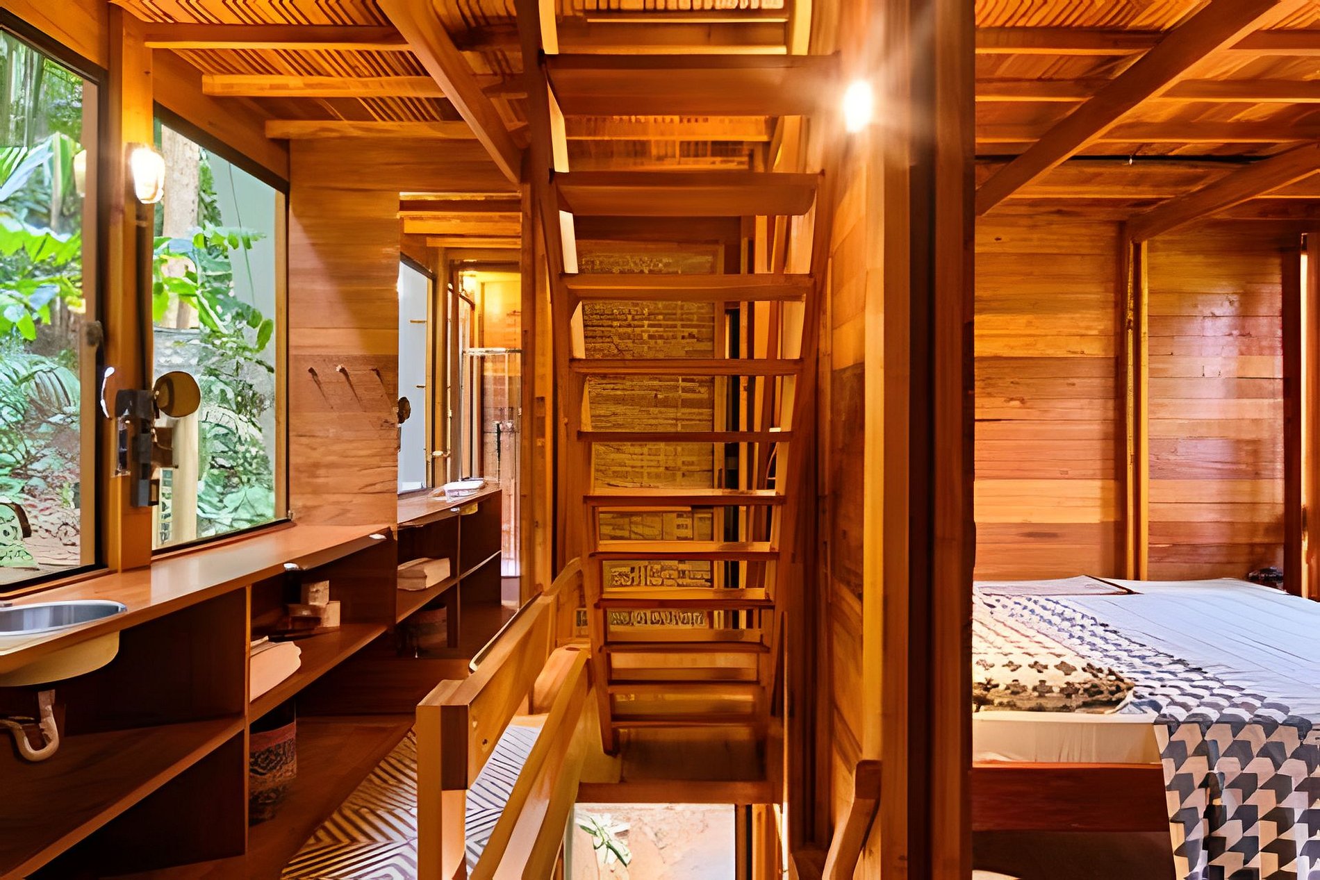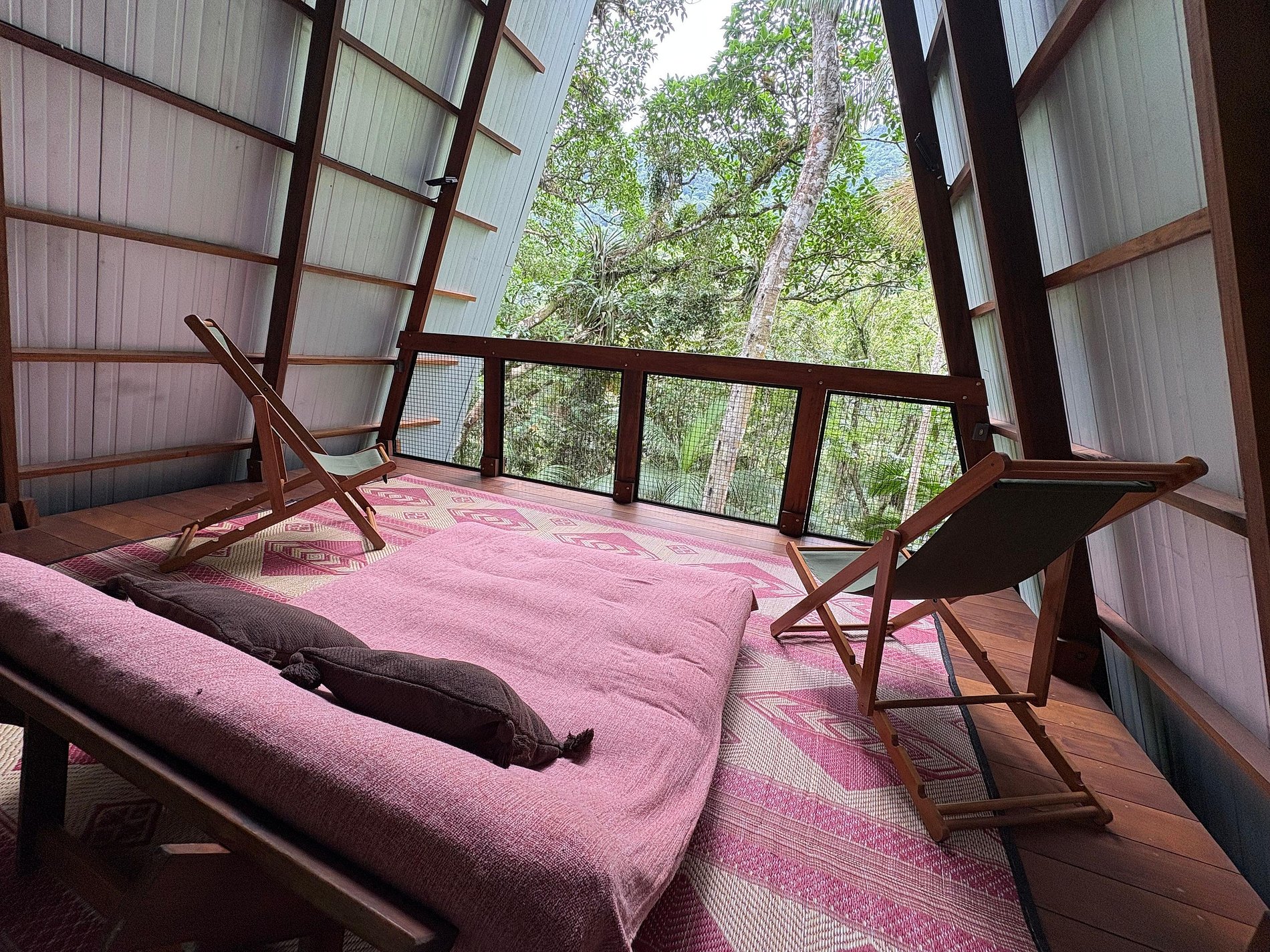 A casa possui um quarto com cama de casal e uma sala de estar com um sofá-cama muito confortável (Ortobom), que se transforma em outro quarto de casal quando necessário. A cozinha e o banheiro têm acesso separado, assim como o generoso terraço no último andar, ideal para yoga e lazer. Por fim, no subsolo há uma mesa e uma churrasqueira gourmet a gás! A tipologia da casa combina a arquitetura indígena brasileira com o artesanato contemporâneo em madeira fina e materiais tecnológicos, permitindo uma construção leve e sustentável que se integra suavemente ao terreno, sem interferências.