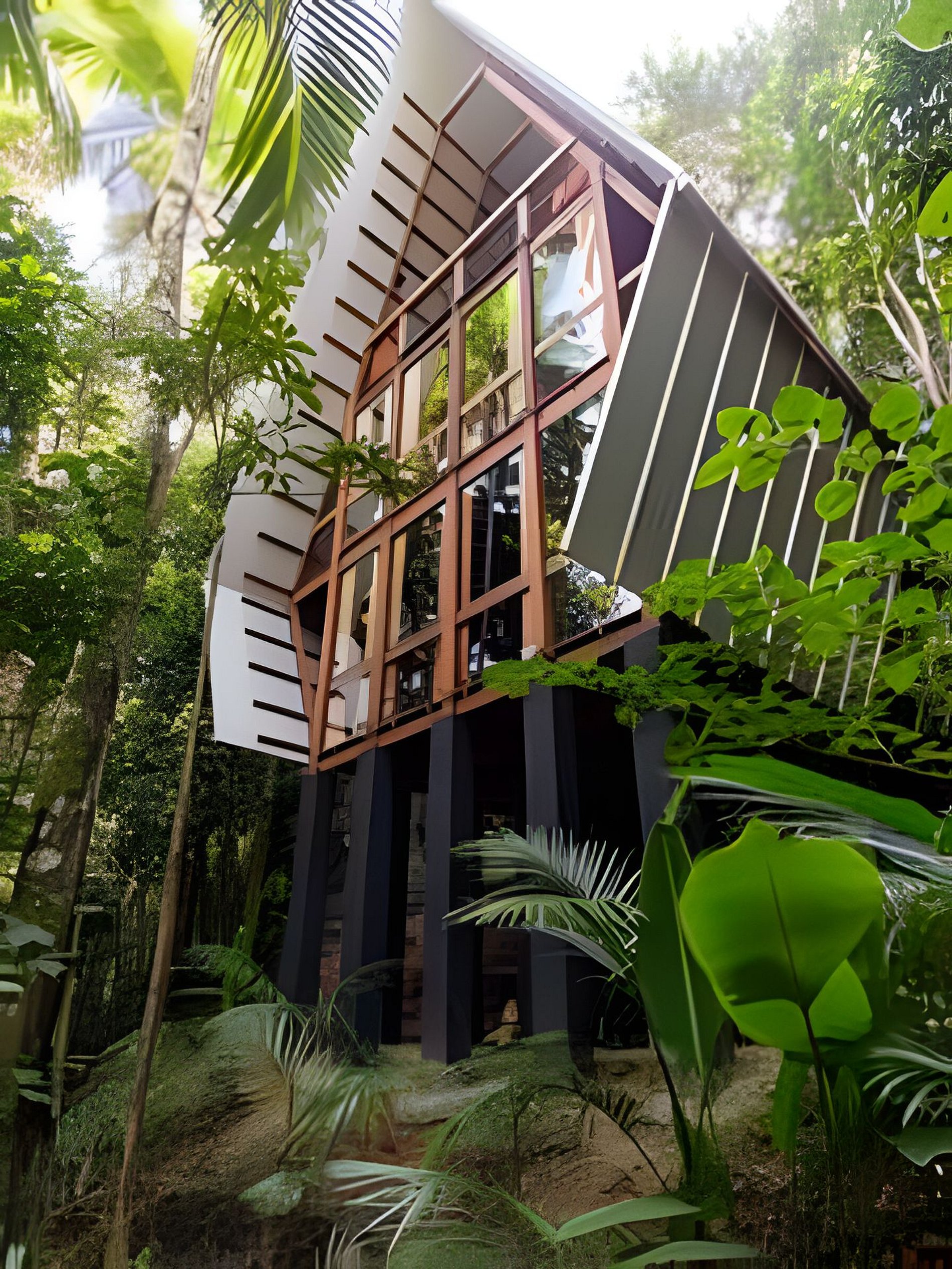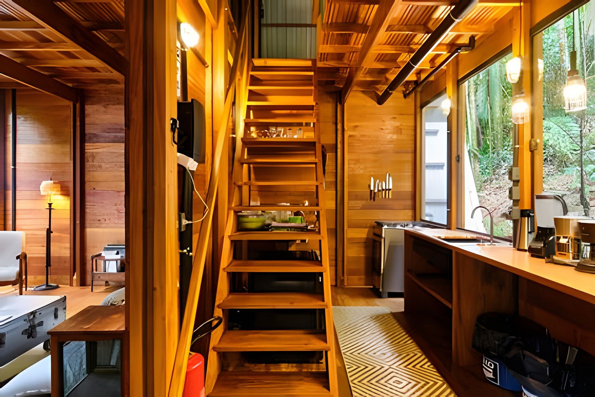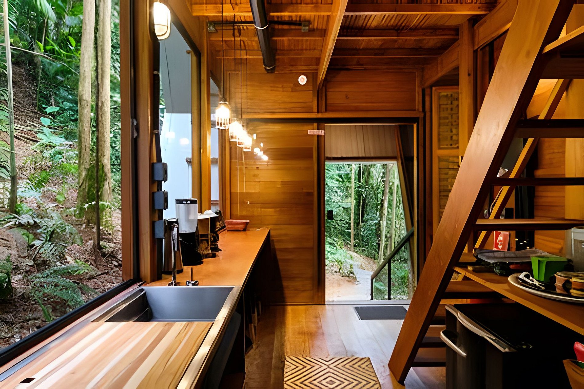 A casa possui um quarto com cama de casal e uma sala de estar com um sofá-cama muito confortável (Ortobom), que se transforma em outro quarto de casal quando necessário. A cozinha e o banheiro têm acesso separado, assim como o generoso terraço no último andar, ideal para yoga e lazer. Por fim, no subsolo há uma mesa e uma churrasqueira gourmet a gás! A tipologia da casa combina a arquitetura indígena brasileira com o artesanato contemporâneo em madeira fina e materiais tecnológicos, permitindo uma construção leve e sustentável que se integra suavemente ao terreno, sem interferências.