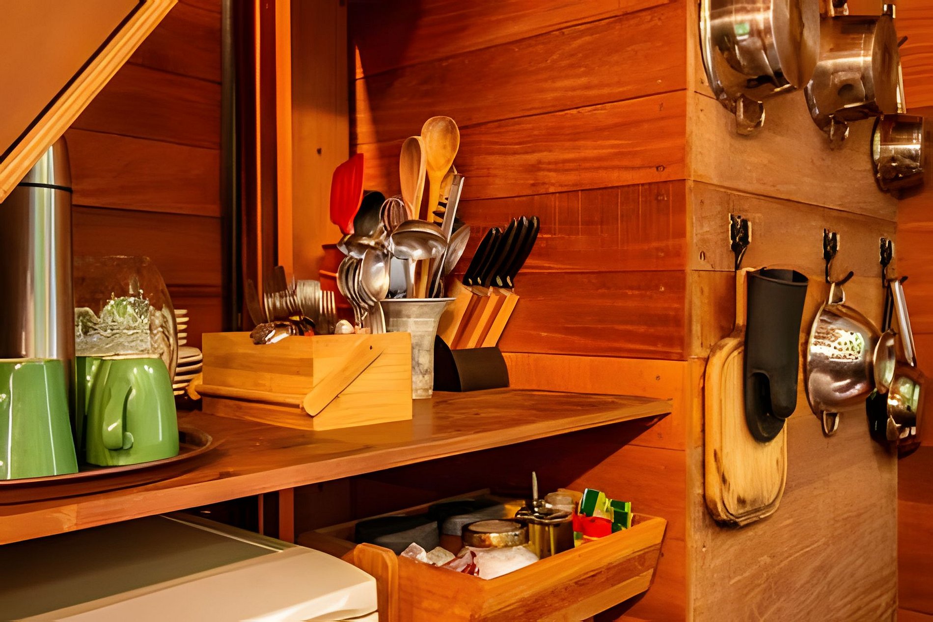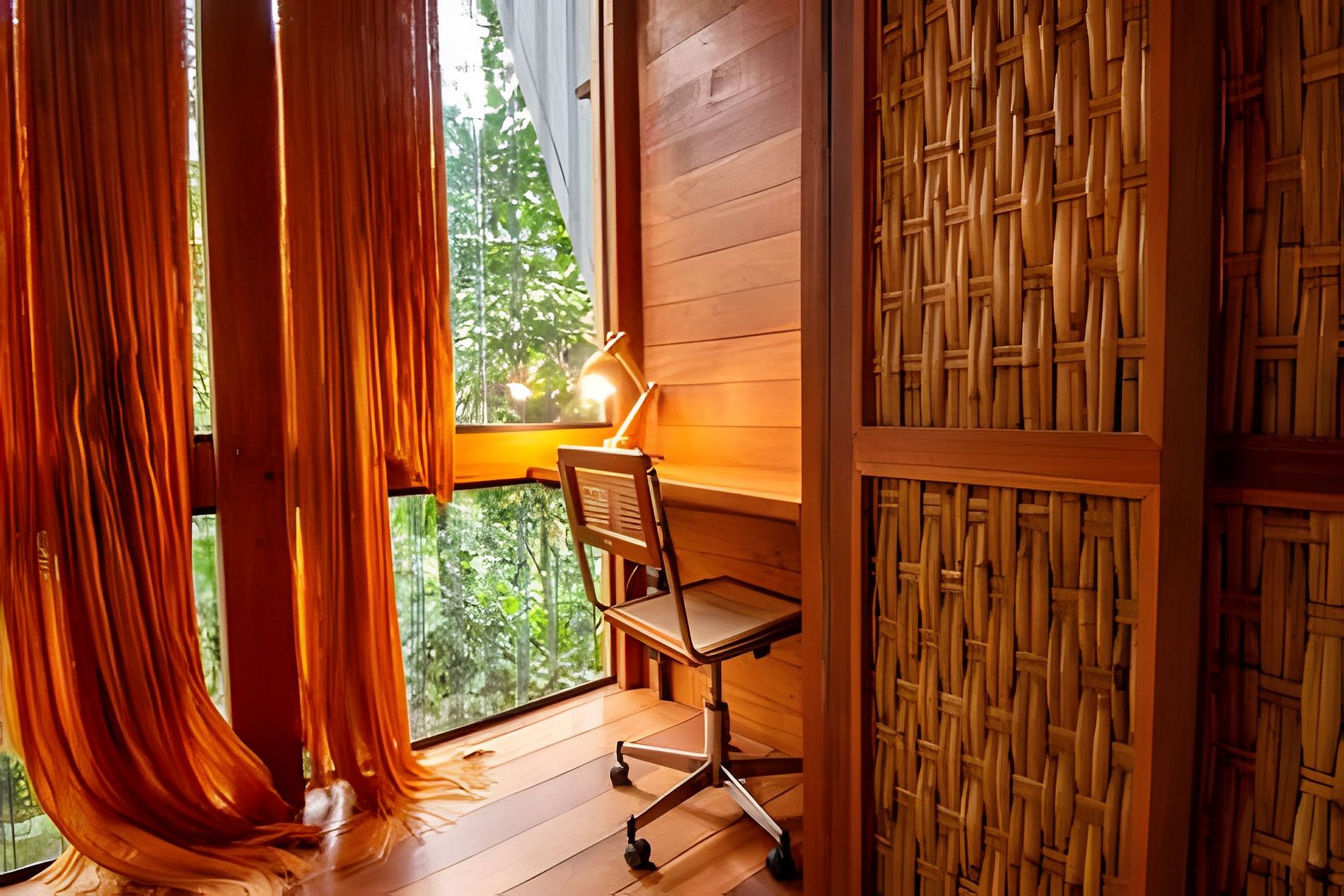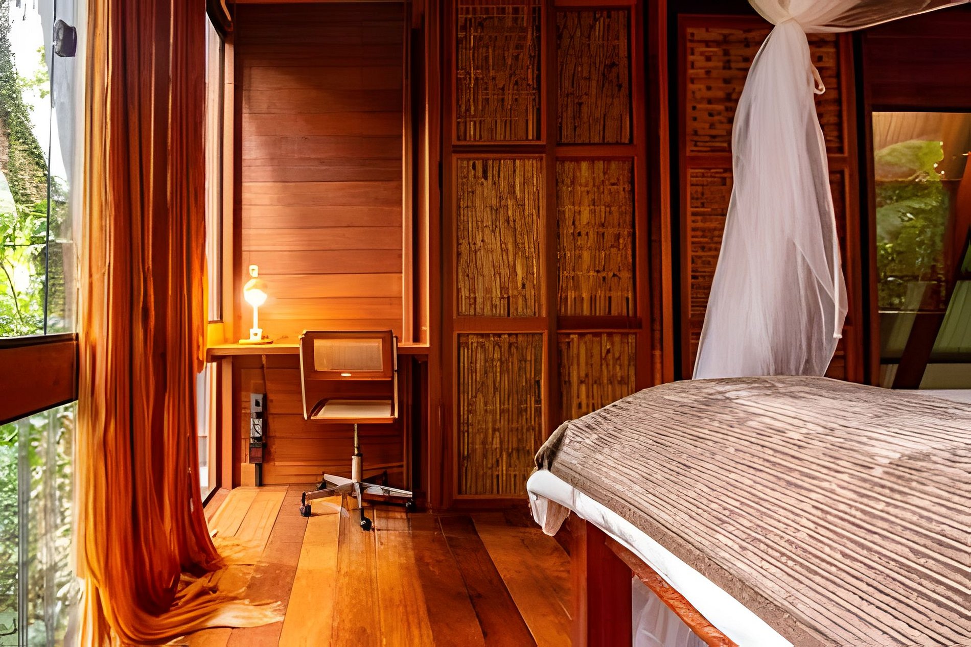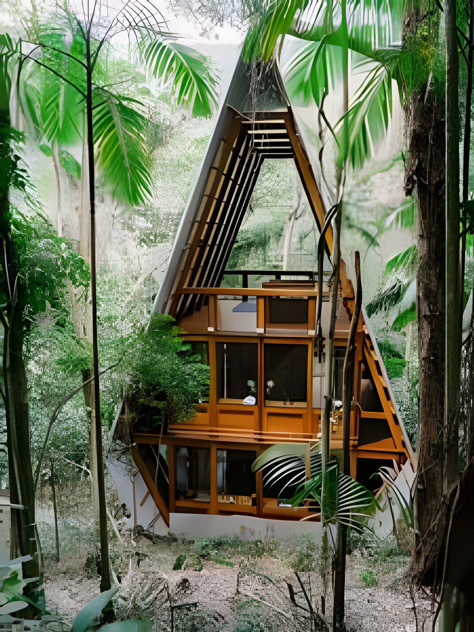 A casa possui um quarto com cama de casal e uma sala de estar com um sofá-cama muito confortável (Ortobom), que se transforma em outro quarto de casal quando necessário. A cozinha e o banheiro têm acesso separado, assim como o generoso terraço no último andar, ideal para yoga e lazer. Por fim, no subsolo há uma mesa e uma churrasqueira gourmet a gás! A tipologia da casa combina a arquitetura indígena brasileira com o artesanato contemporâneo em madeira fina e materiais tecnológicos, permitindo uma construção leve e sustentável que se integra suavemente ao terreno, sem interferências.
