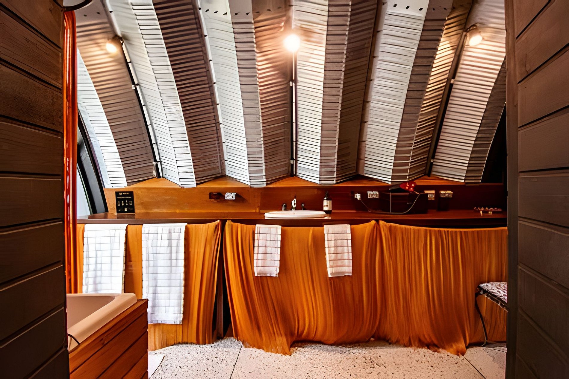 As casas da Aldeia Rizoma unem conforto, sustentabilidade e tecnologia, com projeto do Atelier Marko Brajovic e mínima pegada de carbono. O tratamento de águas, incluindo biodigestores, e o uso racional de energia refletem o compromisso ambiental da Aldeia. Abastecidas por energia solar e conectadas à rede elétrica, contam com gerador automático. Têm chuveiros a gás, água proveniente da nascente local, internet Starlink e voltagem 220V (tomadas 110V sinalizadas). A sauna pode ser usada com agendamento e taxa de R$ 280; cachoeira e academia são de uso comum. Animais pequenos são aceitos com taxa extra de R$ 250. Para check-in após 20h, considerar taxa de R$ 150, e após 00h00, R$ 250.