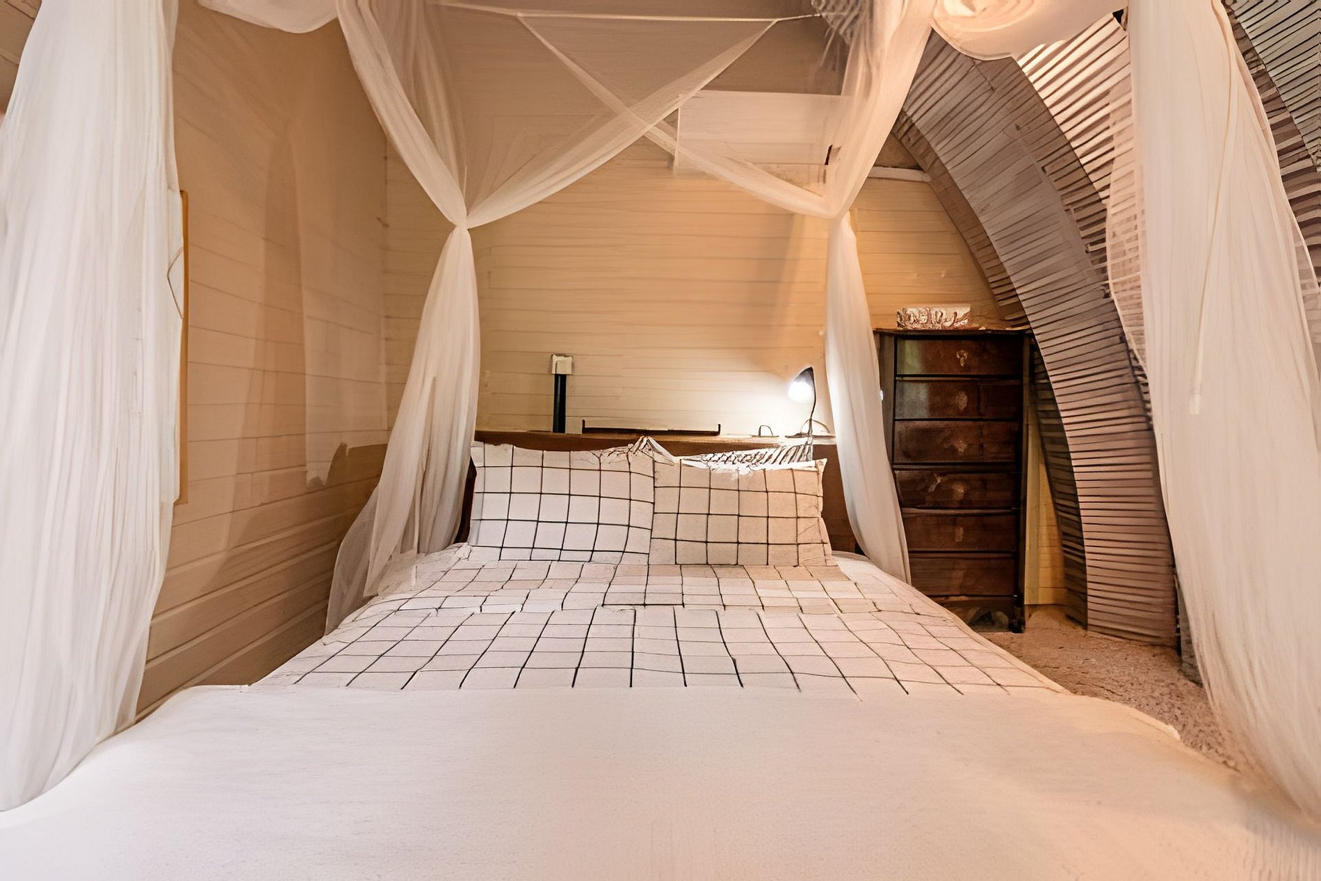 A sala é muito ampla e confortavel e a cozinha completa e integrada. O quarto é pequeno mas aconchegante. A cama é queen size. Tem um mosquiteiro e ar condicionado. O telhado da casa tem um sistema de refrigeração natural com agua. A segunda cama é um futon de casal que fica montado num canto da sala quando recebemos 4 hospedes.