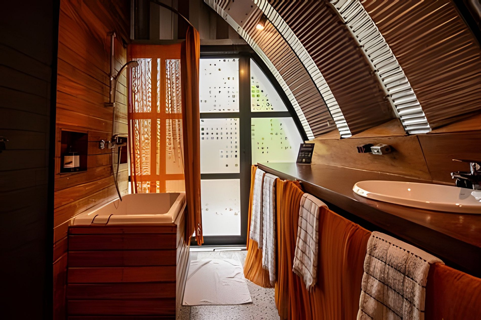 As casas da Aldeia Rizoma unem conforto, sustentabilidade e tecnologia, com projeto do Atelier Marko Brajovic e mínima pegada de carbono. O tratamento de águas, incluindo biodigestores, e o uso racional de energia refletem o compromisso ambiental da Aldeia. Abastecidas por energia solar e conectadas à rede elétrica, contam com gerador automático. Têm chuveiros a gás, água proveniente da nascente local, internet Starlink e voltagem 220V (tomadas 110V sinalizadas). A sauna pode ser usada com agendamento e taxa de R$ 280; cachoeira e academia são de uso comum. Animais pequenos são aceitos com taxa extra de R$ 250. Para check-in após 20h, considerar taxa de R$ 150, e após 00h00, R$ 250.